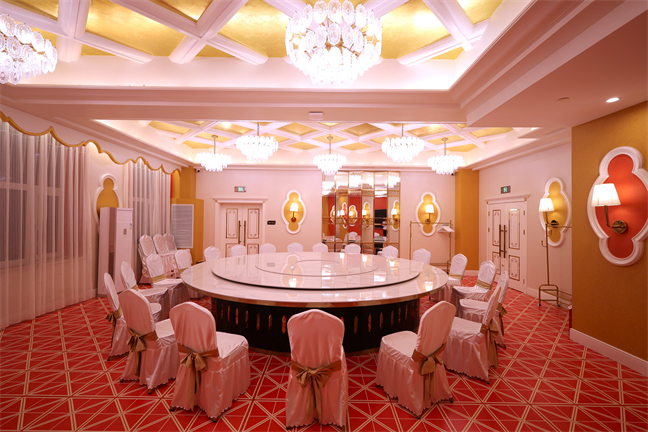 永利宮—優(yōu)雅大氣、雍容華貴,位于大酒店北樓一層,面積392㎡,可承接20桌的中小型宴會。